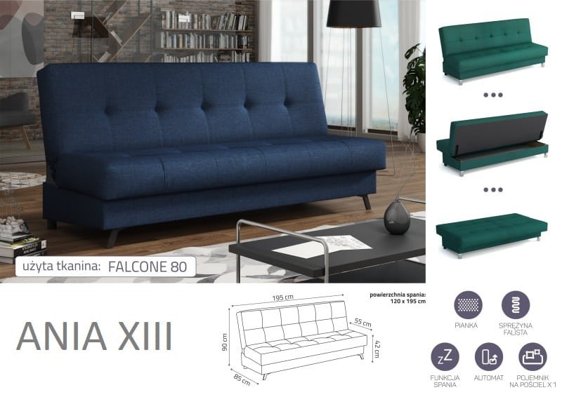 Funkcja spania zmieni sofę w wygodne łóżko, a automat ułatwiający rozkładanie sprawi, że będzie to szybkie i wygodne. Pojemnik pod siedziskiem pomieści pościel. Wypełnienie siedziska sprężyną oraz pianką zapewni wygodę siedzenia i spania. Szeroka gama kolorystyczna sprawi, że sofa ANIA może być zarówno młodzieżowa, jak i klasyczna. Całość wsparta na wyższych nóżkach, które dodają lekkości. Pikowane siedziska i oparcie sprawiają, że klasyczne rozwiązania stają się modne i nowoczesne.