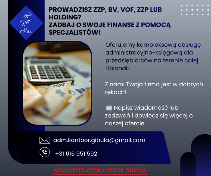 Prowadzisz BV, VOF, ZZP lub holding? Zadbaj o swoje finanse z pomocą specjalistów! Oferujemy kompleksową obsługę administracyjno-księgową dla przedsiębiorców na terenie całej Holandii.