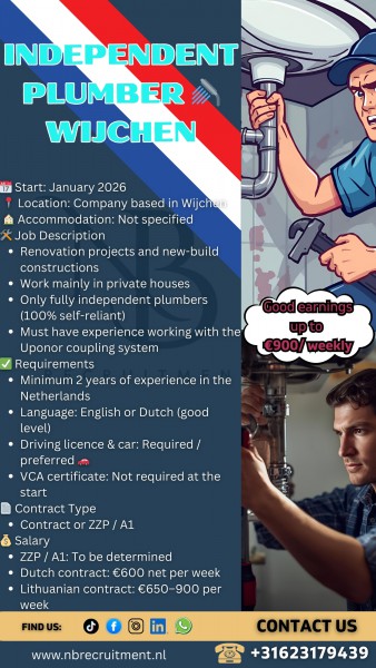 Certyfikat: VCA – niewymagany Informacje: renowacje i nowe budownictwo; domy prywatne; pełna samodzielność; praca z systemem Uponor Umowa: kontrakt lub ZZP/A1 Doświadczenie: min. 2 lata w NL