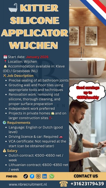Wynagrodzenie: kontrakt NL: 500–650 € netto/tydz. kontrakt LT: 600–850 €/tydz.