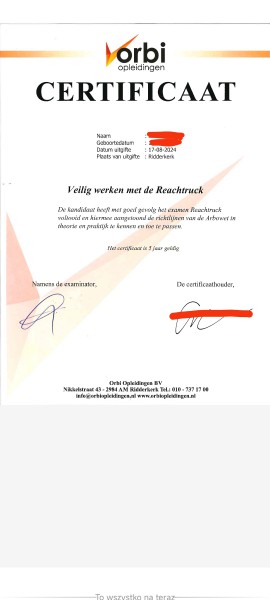 Witam, oferuję pomoc w uzyskaniu certyfikatów VCA, AZBEST, REAGOWANIE AWARYJNE, KOD95, LOGISTYKA, SOG, RUSZTOWANIE, ZANIECZYSZCZONA GLEBA, BEZPIECZNA PRACA Z SUBSTANCJAMI CHEMICZNYMI. Jeśli jesteś zainteresowany zapraszam do kontaktu poprzez wiadomość whatsapp. Napisz, odezwę się do ciebie i pomogę uzyskać to co dla ciebie potrzebne
