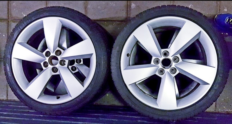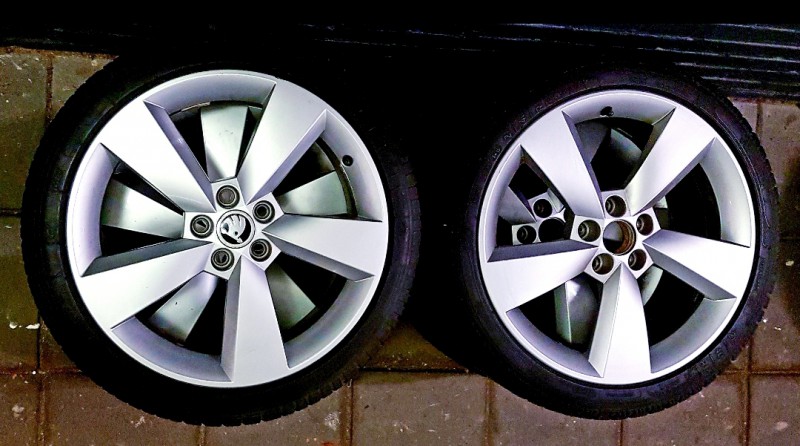 Piękne Oryginalne felgi Skoda 17 cali 5x100, pasujące do wielu modeli z grupy VAG (Audi A1, Seat Ibiza, Skoda Fsbia, VW Polo) z bardzo dobrymi oponami ALL SEASON 215/40/R17.