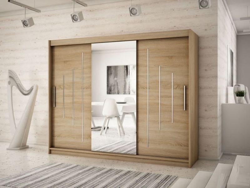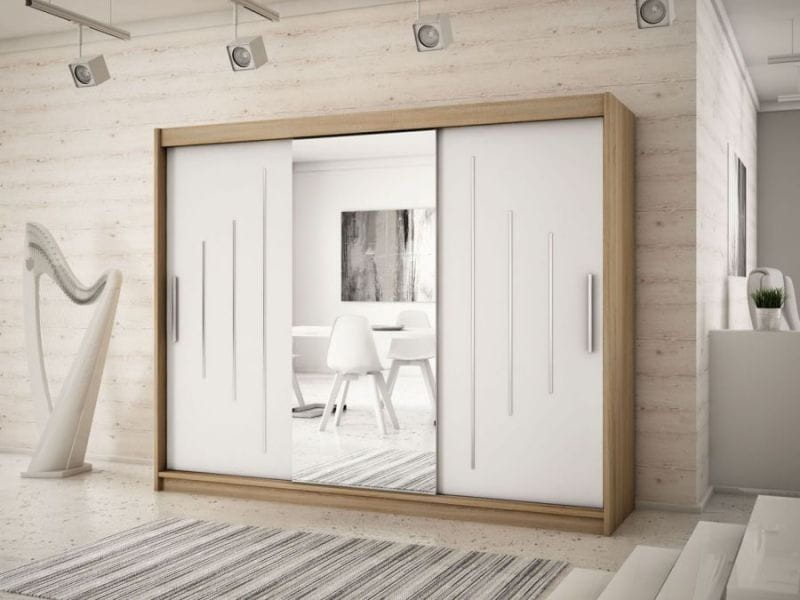 Bezsprzecznie duża szafa trzydrzwiowa pełni rolę funkcjonalną. To prawdziwa domowa garderoba. Jednak prezentowany model cechuje się również świetnym designem, zatem będzie stanowić istotny element aranżacji wnętrza. Przede wszystkim wykonana jest z wysokiej jakości materiałów, co widać na pierwszy rzut oka. Projektanci wykorzystali do konstrukcji 16 mm płytę laminowaną, zatem model PURMER wyróżnia się solidnością. Subtelny nowoczesny wygląd dopełniają detale. Są to uchwyty w srebrnym kolorze, oraz duże lustro.