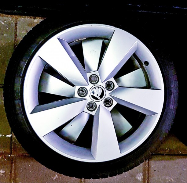 Oryginalne felgi Skoda 17 cali 5x100, pasujące do wielu modeli z grupy VAG (Audi A1, Seat Ibiza, Skoda Fsbia, VW Polo) z bardzo dobrymi oponami ALL SEASON 215/40/R17.