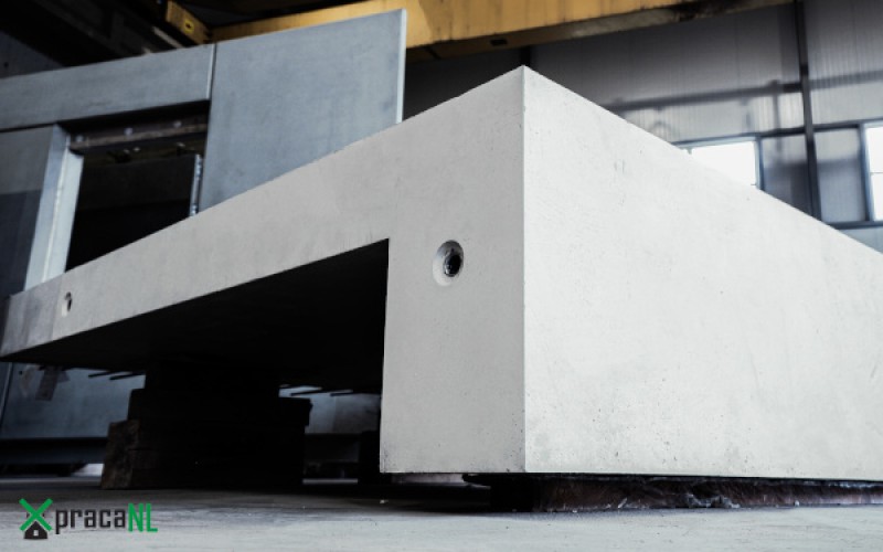 Produkcja bloczków betonowych. Praca nie jest ciężka fizycznie, jednak brudna. Odbywa się w hali produkcyjnej, która jest otwarta, dlatego temperatura jest zbliżona do tej na zewnątrz.