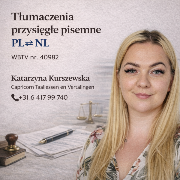 Oferuję rzetelne tłumaczenia przysięgłe pisemne akceptowane przez urzędy w Holandii oraz w Polsce.