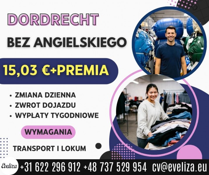 Miejsce pracy DORDRECHT 15,03 € + premia BEZ ANGIELSKIEGO