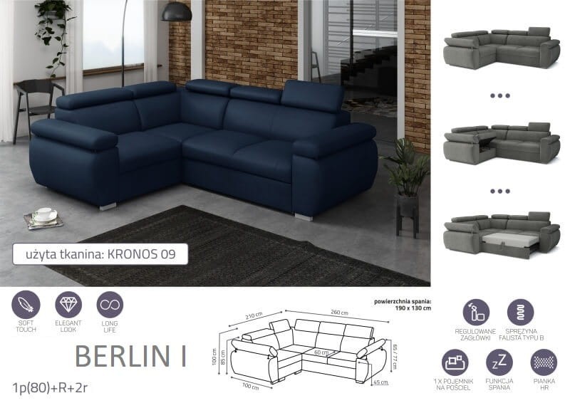 Narożnik BERLIN I to sofa narożna z funkcją spania i pojemnikiem na pościel. Wygodny, zgrabny i solidny mebel, który doskonale będzie spełniał swoją rolę przez długie lata. Regulowane zagłówki i podłokietniki dopasują mebel do Twojej sylwetki. Odpowiednio wysokie oparcie zapewni wsparcie dla całej sylwetki.