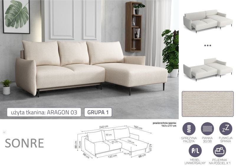 Czym byłby salon bez wygodnej kanapy? Z pewnością taki salon nie mógłby być strefą komfortu i wypoczynku. Narożnik SONRE, jest komfortową kanapą z designerskim wyglądem. Wyróżnia go klasyczny i ponadczasowy design dzięki czemu idealnie wkomponuje się w nowoczesne wystroje wnętrz. Posiada funkcję spania, oraz pojemnik na pościel co daje oazę wytchnienia po ciężkim dniu pracy. Bez problemu zastąpi łóżko sypialniane przed telewizorem, oraz będzie meblem sypialnianym dla gości. Pod korpusem w pojemniku zmieścimy całą pościel na zmianę. W siedzisku zastosowana została wysokiej jakości pianka elastyczna, oraz sprężyna falista, która zapobiega odkształceniom i wysiedzeniu narożnika. Wyjątkowy kształt, miły w dotyku materiał, a także bogata kolorystyka daje poczucie, że zakup kanapy SONRE to strzał w dziesiątkę.