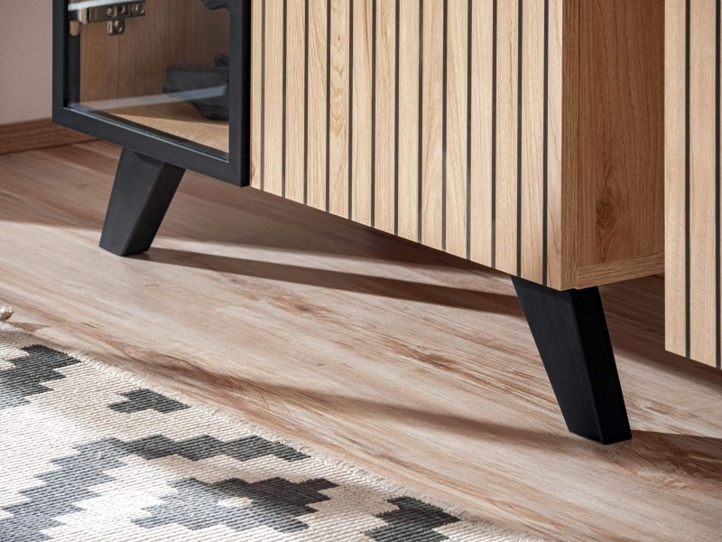 Nowoczesny Design – połączenie matowych korpusów w kolorze hickory jackson z wyjątkową aplikacją na frontach w tym samym odcieniu z czarnymi paskami tworzy elegancki i ponadczasowy wygląd.