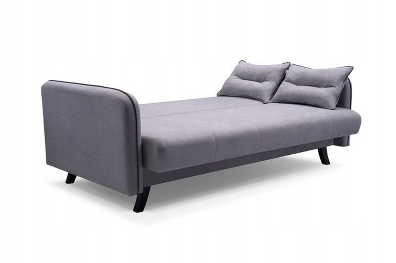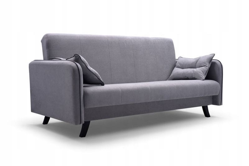 Kanapa PRIMO to funkcjonalna, ale i nowoczesna wersalka. Jest niezwykle wygodna, zachwyca swą oryginalnością. Całość obita została delikatną w dotyku tkaniną w modnej stonowanej kolorystyce. Brzegi podłokietników, oraz poduszek wykończone są czarną lamówką dodającą charakteru. Korpus osadzony został na czarnych drewnianych nóżkach, lekko unosząc całość, ale też ułatwiając sprzątanie pod meblem. Wersalka posiada funkcję spania, oraz pojemnik na pościel, dzięki czemu idealnie sprawdzi się w pokoju młodzieżowym, oraz salonach, które wieczorami zamieniają się w sypialnie.