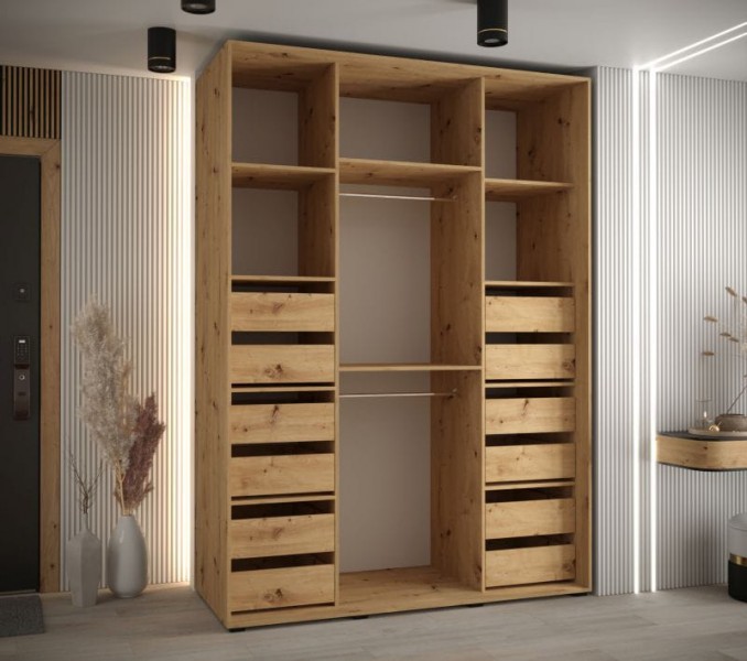 Jednym z elementów dla którego nie może zabraknąć miejsca w mieszkaniu jest pojemna szafa. Najlepiej jeśli będzie i pojemna, i pięknie wyglądać. CANON to mebel łączący w sobie właśnie pojemność, oraz elegancki styl. Wewnątrz prezentowanej szafy znajdują sie dwie lub trzy odrębne komory (w zależności od szerokości) wyposażone w drążki na wieszaki, oraz pojemne półki, a także szuflady na bieliznę, oraz bibeloty(opcja dodatkowa). Czarne elementy, takie jak listwa w górnej części szafy, uchwyty, oraz nóżki dodają szafie charakteru. Możesz ją ustawić w salonie, sypialni, oraz przedpokoju. W każdym z tych pomieszczeń na pewno będzie przykuwać wzrok gości. W szafie zastosowano przesuwne drzwi na prowadnicach firmy BIMARK, dzięki czemu po otwarciu szafy nie potrzeba dodatkowego miejsca na fronty. Nie będzie kolidować z innymi meblami, a także świetnie się sprawdzi w wąskim przedpokoju.