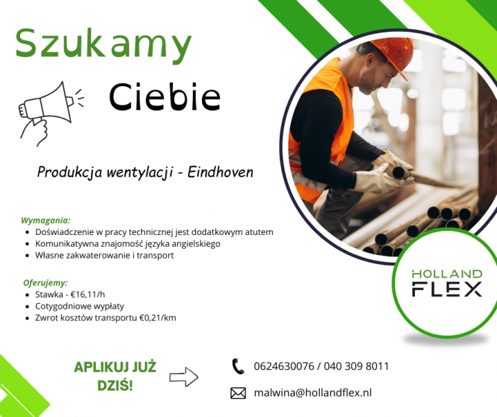 Agencja Holland Flex poszukuje kandydatów do pracy przy produkcji systemów wentylacyjnych w Eindhoven.