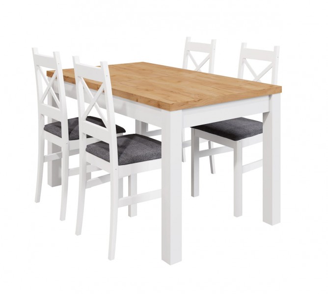 Zestaw jadalniany niezbędny w każdym domu. Propozycja niezbędna do kuchni lub jadalni. Złożony ze stabilnego stołu z pięknym, grubym blatem. Dostawiono do niego solidne krzesła, na których wygodnie zasiądą domownicy lub goście.