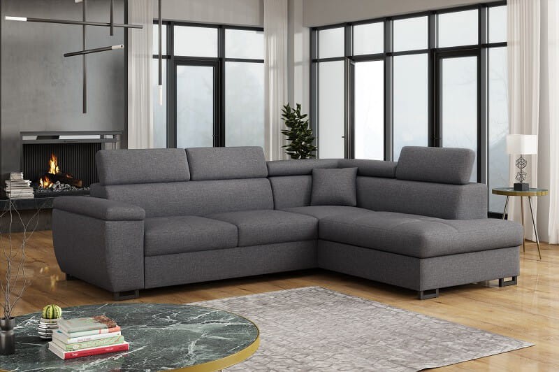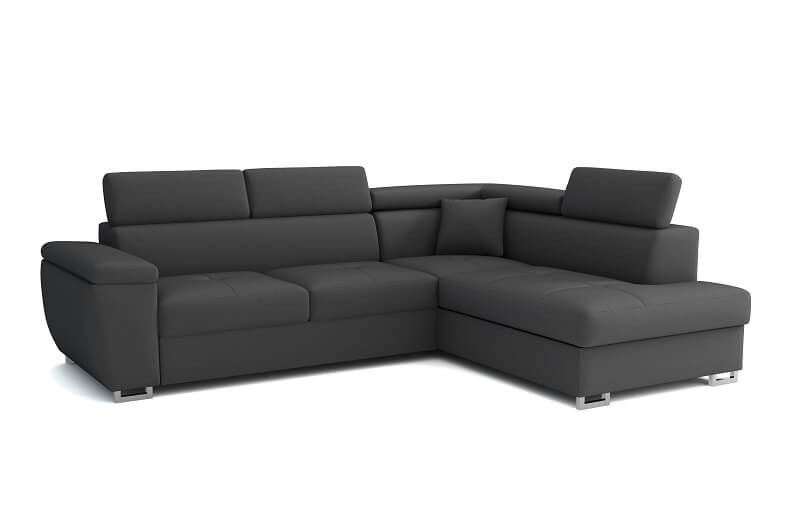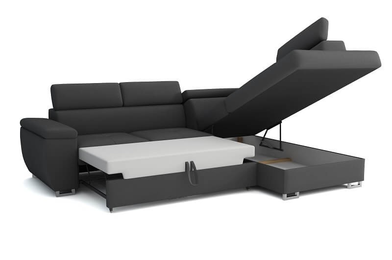 Narożnik wyposażony w funkcję spania, która doda w Twoim salonie dodatkowe miejsce noclegowe. Pojemnik pod siedziskiem to idealne miejsce na komplety pościeli. Wypełnienie sprężyną falistą oraz pianką, które zapewnią wygodę siedzenia oraz spania. Automat ułatwiający rozkładanie pomoże Ci zamienić narożnik w łóżko w zaledwie kilka sekund. Tak samo szybko i sprawnie złożysz go następnego dnia. Regulowane zagłówki spełnią swoją rolę podczas czytania lub oglądania telewizji.