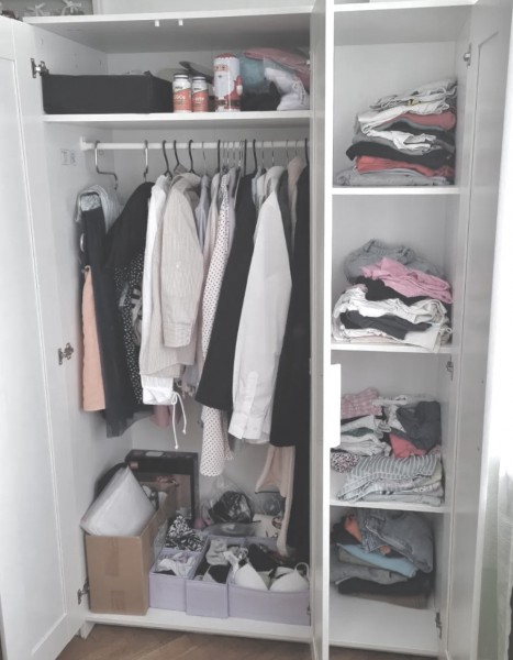 *3-drzwiową biała szafę z lustrem. W szafie są półki i drążek na wieszaki. Wymiary: 190x130x50