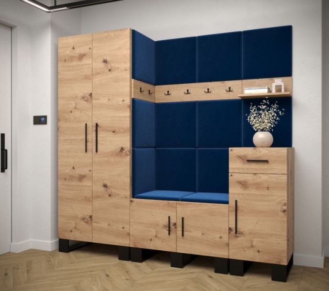 Garderoba MARTIN to kombinacja wielu nowoczesnych brył w taki sposób, aby funkcjonalnie wyposażyć Twoje wnętrze. Ergonomiczne wymiary zapewnią swobodne umeblowanie każdego przedpokoju. Niebywałym atutem są panele tapicerowne, które dodają przytulności, oraz idealnie komponują się z płytą w kolorze dąb artisan, tworząc przyjemne wnętrze.