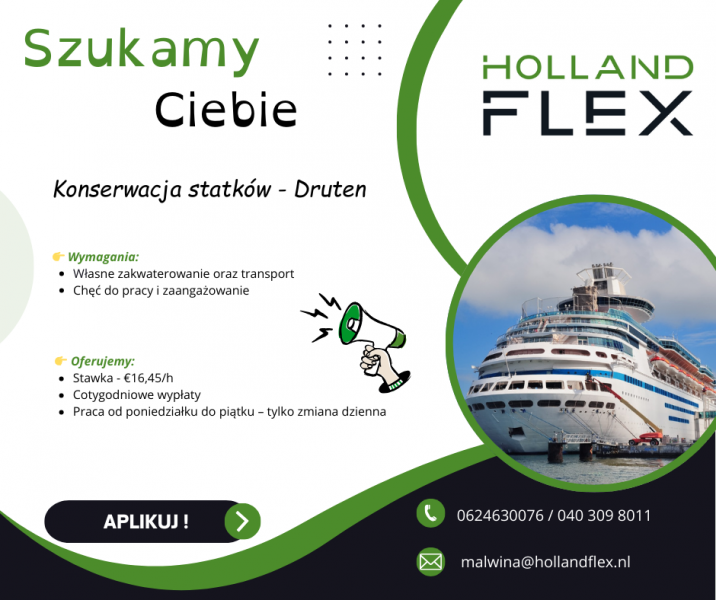 Agencja Holland Flex poszukuje osób do pracy przy konserwacji statków w Druten. Jest to stabilna oferta pracy na jedną zmianę, od poniedziałku do piątku.