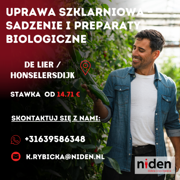 Poszukujemy osób do pracy w nowoczesnej szklarni przy papryce. Praca polega na sadzeniu roślin oraz aplikacji i rozmieszczaniu biologicznych środków wspierających uprawę.