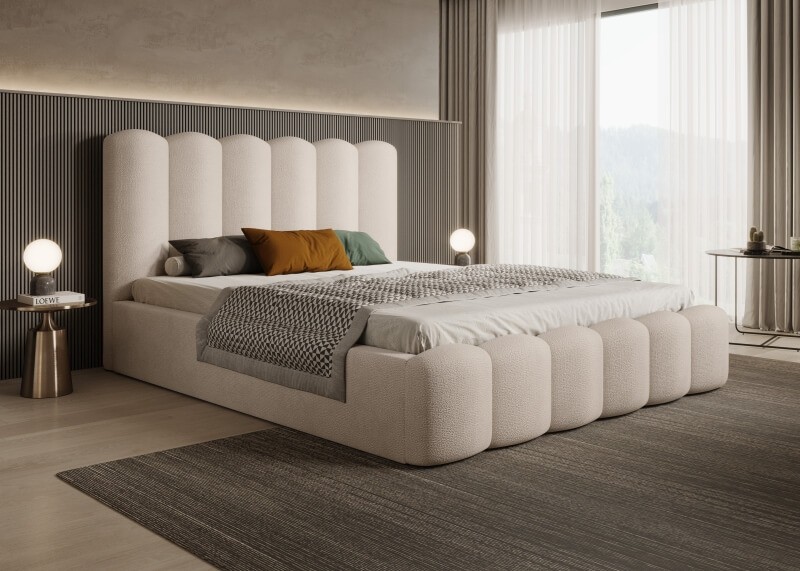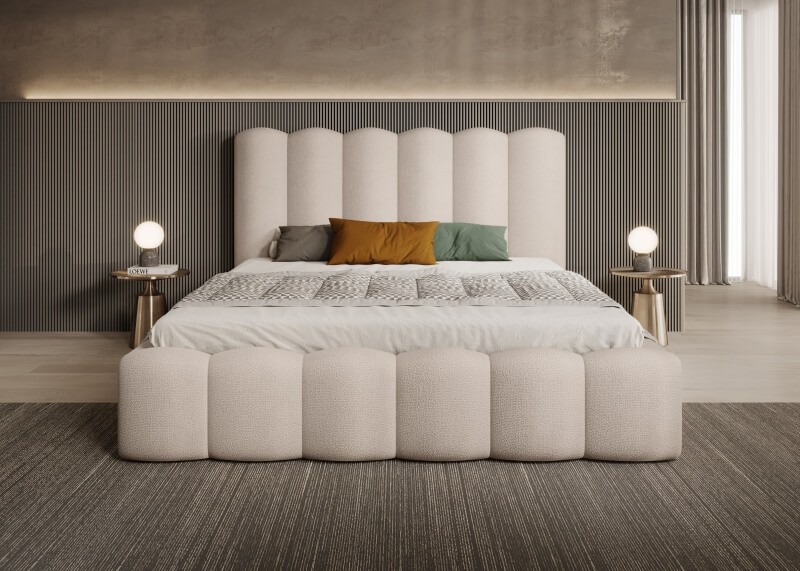 To piękne i nowoczesne tapicerowane łóżko sypialniane z pojemnikiem. Będzie zarówno wygodnym miejscem do spania, jak i ozdobą sypialni. Masywny i solidnie wykonany korpus zapewni stabilność. Duże i ciekawe wezgłowie dopełnia całości i przyciąga uwagę.