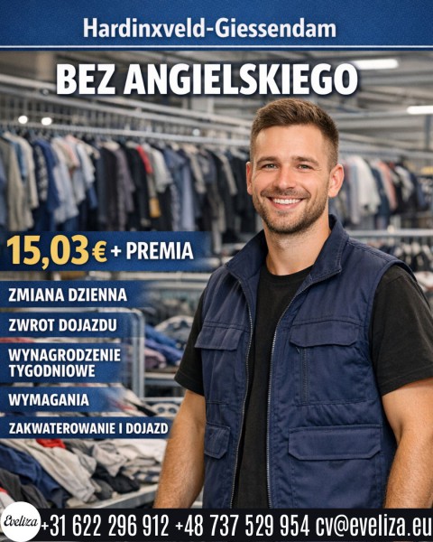 Miejsce pracy Hardinxveld-Giessendam 15,03 € + premia BEZ ANGIELSKIEGO