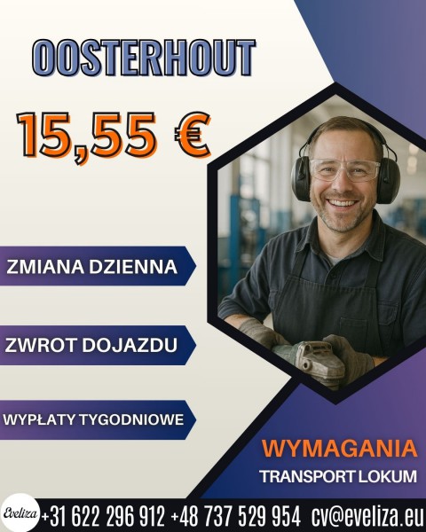 • Zmiana dzienna 7:00 - 15:45 poniedziałek - czwartek 7:00 - 14:45 piątek, możliwa praca w soboty.