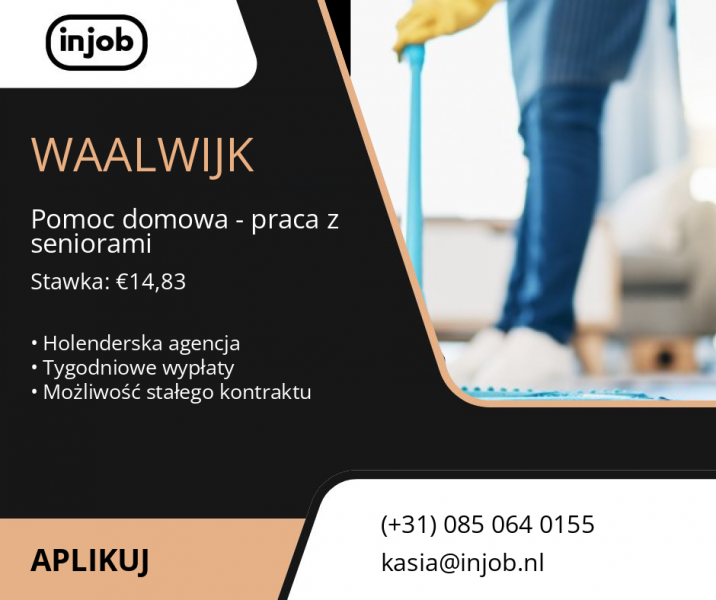 Do zadań należy sprzątanie i pomoc w codziennych obowiązach takich jak odkurzanie, pranie, prasowanie. Praca opiera się na elastycznych godzinach od poniedziałku do piątku w godzinach od 08:30 do 20:00 oraz w soboty od 08:00 do 12:00. . Warunkiem koniecznym jest dobry holenderski lub angielski i empatyczne podejście do osób starszych.