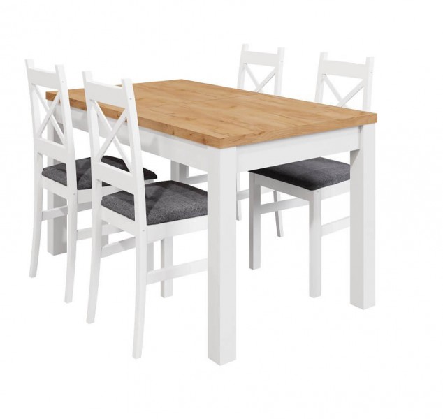 Zestaw jadalniany do salonu lub jadalni. Przy rozkładanym stole znajdą miejsce domownicy i goście. Wygodne krzesła zapewnią komfort przy wspólnych posiłkach. Na szerokim, solidnym blacie zmieści się cała zastawa.