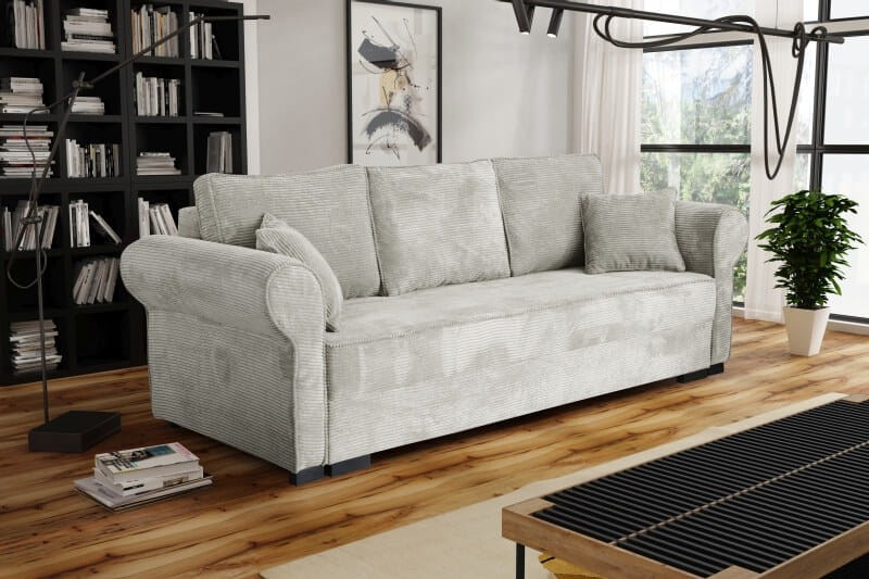 Nowoczesna sofa z funkcją spania i pojemnikiem na pościel. Wykończona mięciutką w dotyku tkaniną plamoodporną i wodoodporną. Doskonale sprawdzi się zarówno w salonie, jak i pokoju młodzieżowym. To wygodny i ponadczasowy mebel, który w nocy zamieni się w wygodne łóżko. Solidna, stabilna i modna urzeka od pierwszego wejrzenia.
