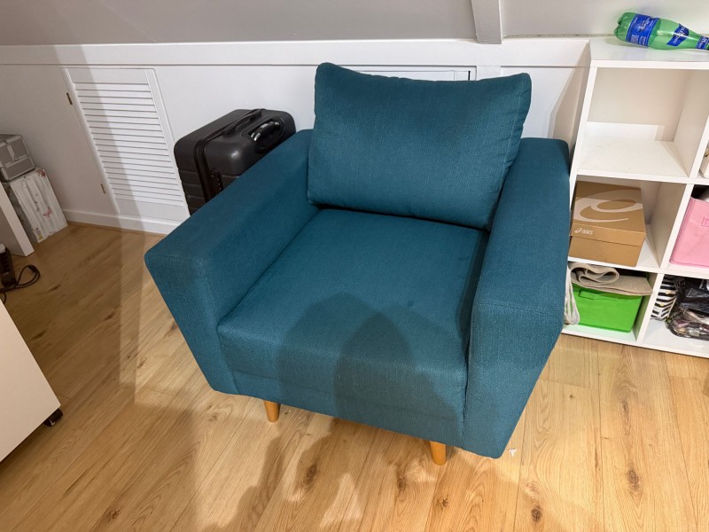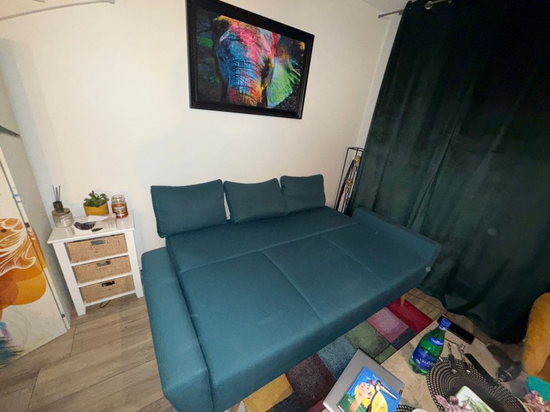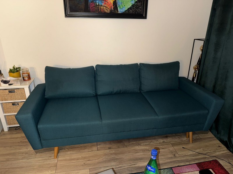 Wygodna sofa rozkładana z pasującym fotelem. Sofa ma 230 cm szerokości i oferuje powierzchnię spania 200 x 140 cm. Idealna dla gości lub do małych pomieszczeń. Zestaw jest w dobrym stanie i zapewnia komfort siedzenia i spania.