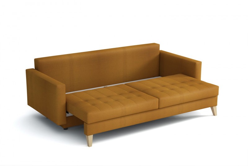 Elegancka sofa z funkcją spania i pojemnikiem na pościel. Idealna jako wygodna kanapa do pokoju młodzieżowego oraz rozkładana sofa do salonu. Wyposażona w dodatkową funkcję spania, która po rozłożeniu zamieni ją w wygodne łóżko. Pojemnik pod siedziskiem przechowa dodatkowe komplety pościeli. Dzięki łatwemu i szybkiemu składaniu i rozkładaniu łatwiej utrzymasz ład i porządek.