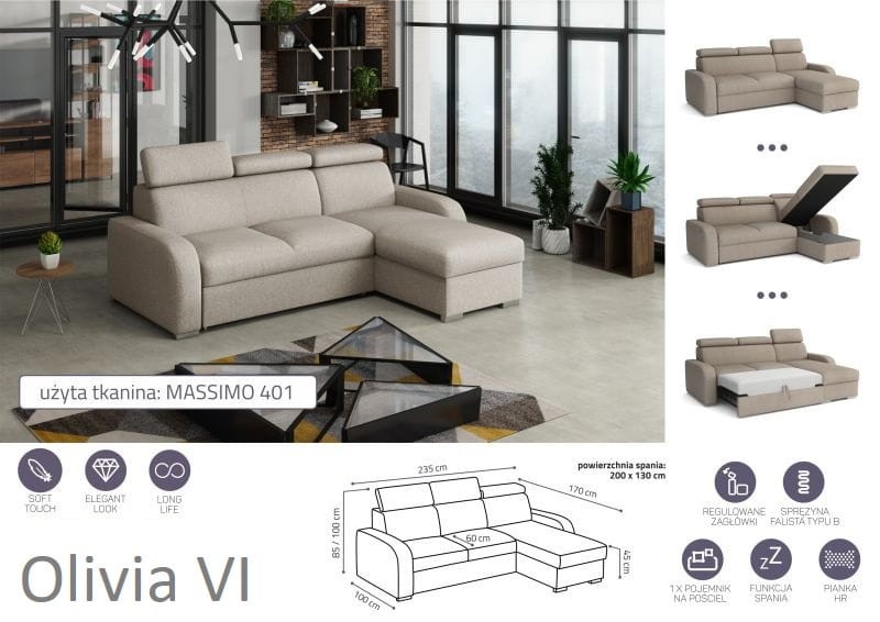 Narożnik OLIVIA VI sprawdzi się u osób lubiących rozsiąść się wygodnie przed telewizorem po ciężkim dniu pracy. Nieduży, zgrabny narożnik sprawdzi się w przestronnym metrażu, oraz mniejszej kawalerce. Siedzisko wypełnione zostało wysokogatunkową pianką HR, oraz sprężynami falistymi typu B, dzięki czemu zyskujesz miękkie i komfortowe miejsce wypoczynkowe. Dzięki idealnie wyprofilowanym podłokietnikom, możesz wygodnie oprzeć ręce, a wszystko po to, aby utrzymać prawidłową postawę ciała, nawet podczas długich maratonów filmowych. Regulowane zagłówki to dodatkowy atut kanapy. Podtrzyma głowę, byś mógł relaksować sie przez długi czas.