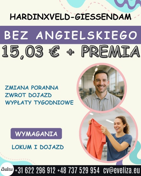 Miejsce pracy Hardinxveld-Giessendam 15,03 € + premia BEZ ANGIELSKIEGO