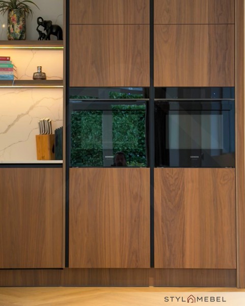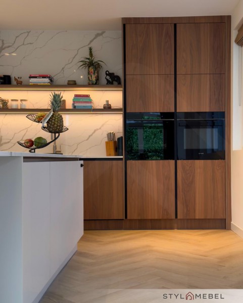 Ciepły orzech, jasny mat i spójna linia kamienia. W tej realizacji postawiliśmy na kontrast materiałów i czystą geometrię, żeby kuchnia była jednocześnie przytulna i bardzo uporządkowana.