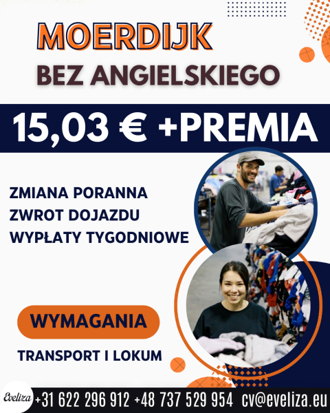 Miejsce pracy DORDRECHT 15,03 € + premia BEZ ANGIELSKIEGO