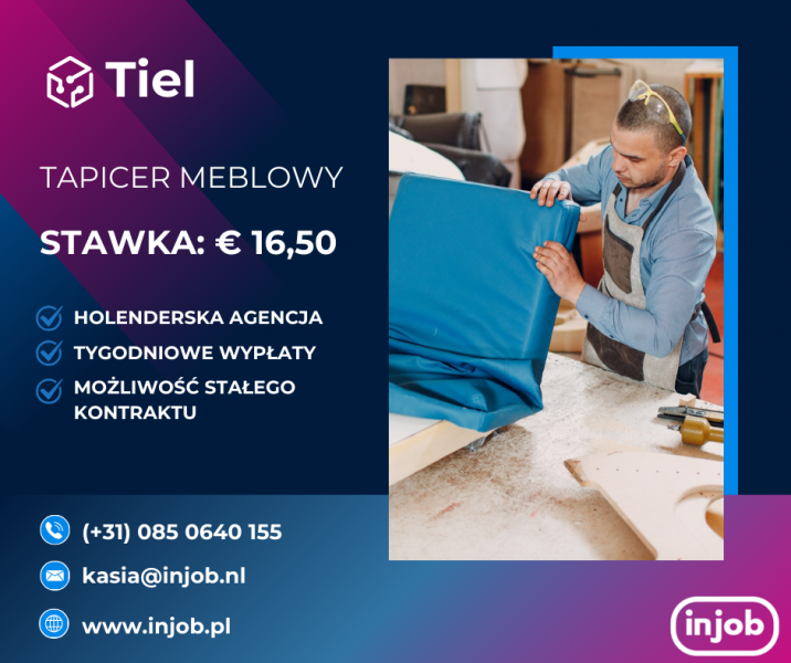 Zakres obowiązków obejmuje tapicerowanie mebli materiałem i skórą oraz nakładanie pianki na drewniane ramy.