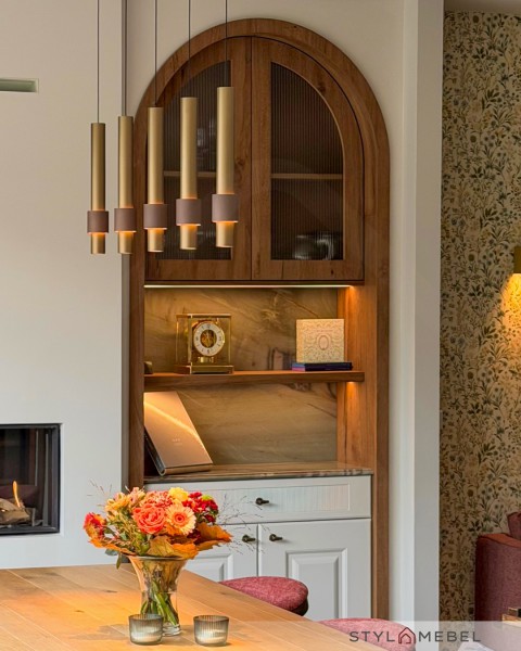 Zabudowa, która porządkuje przestrzeń i robi klimat od pierwszego spojrzenia. Łuki, nieregularne kształty i ciepłe podświetlenie sprawiają, że ta strefa wygląda lekko, a jednocześnie bardzo „premium”. Do tego miks drewna, kamienia i frezowanych frontów malowanych pod kolor ścian, żeby całość była spójna z wnętrzem.