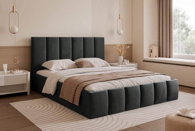 To piękne i nowoczesne łóżko sypialniane z pojemnikiem. Będzie zarówno wygodnym miejscem do spania, jak i ozdobą sypialni. Masywny i solidnie wykonany korpus zapewni stabilność. Duże i ciekawe wezgłowie dopełnia całości i przyciąga uwagę - dostępne w dwóch rozmiarach wysokość 90cm i 110cm.