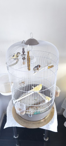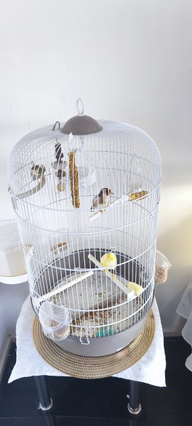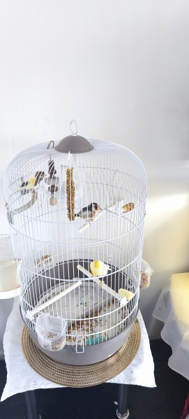 Sprzedam piękną młodą parę kanarków z poczatka 2025 Samiczka z charakterystyczną czapka na głowie gloster wraz z klatka i akcesoriami.Ptaszki zupełnie zdrowe .