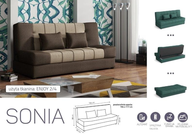 Klasyczna wersalka z funkcją spania SONIA NEW może zostać wykończona wybranym połączeniem kolorystycznym. W galerii produktu każdy model został opisany użytą tkaniną. Wpisz w numer wariantu nazwę i numer tkaniny.
