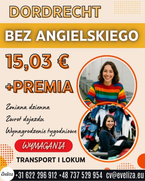 Miejsce pracy DORDRECHT 15,03 € + premia BEZ ANGIELSKIEGO