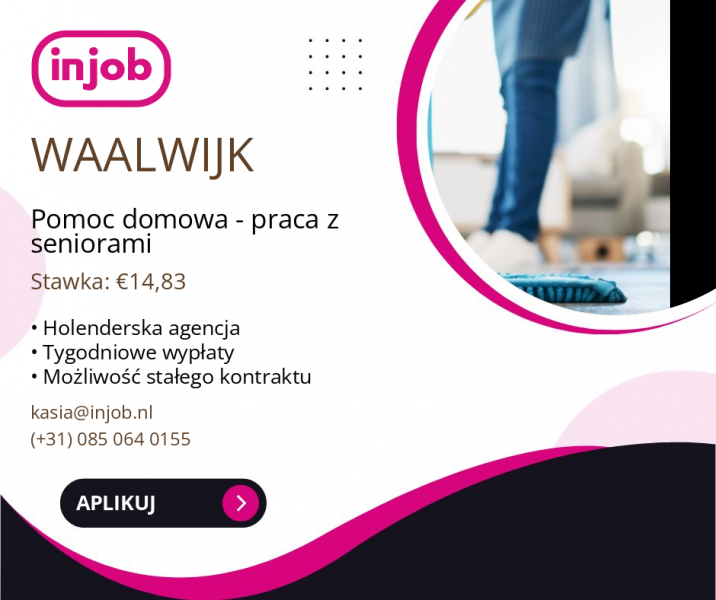 Do zadań należy sprzątanie i pomoc w codziennych obowiązach takich jak odkurzanie, pranie, prasowanie. Praca opiera się na elastycznych godzinach od poniedziałku do piątku w godzinach od 08:30 do 20:00 oraz w soboty od 08:00 do 12:00. . Warunkiem koniecznym jest dobry holenderski lub angielski i empatyczne podejście do osób starszych.