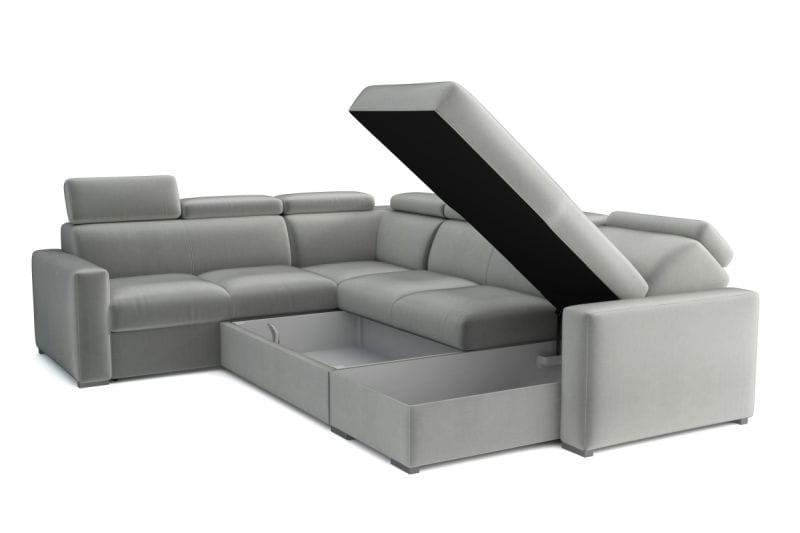 Narożnik PADRE to prosta kanapa przyciągająca wzrok dzięki swej estetyce i dopracowaniu w najmniejszym szczególe. Nieduży, zgrabny narożnik sprawdzi się w przestronnym metrażu, oraz mniejszej kawalerce. Ponadczasowy kształt litery L narożnika PADRE zapewnia wystraczająco dużo miejsca do siedzenia i odpoczynku. Dzięki temu możesz zaprosić gości i przyjaciół do salonu, bez obaw, że dla kogoś zabraknie miejsca. Dzięki idealnie wyprofilowanym podłokietnikom, możesz wygodnie oprzeć ręce, a wszystko po to, aby utrzymać prawidłową postawę ciała, nawet podczas długich maratonów filmowych. Regulowane zagłówki to dodatkowy atut kanapy. Podtrzyma głowę, byś mógł relaksować sie przez długi czas. Siedzisko wypełnione zostało wysokogatunkową pianką HR, oraz sprężynami falistymi typu B, dzięki czemu zyskujesz miękkie i komfortowe miejsce wypoczynkowe .Dzięki funkcji spania łatwo możesz zamienić narożnik w wygodne łóżko .Dodatkowo, narożnik posiada pojemnik na pościel, który jest funkcjonalny i umożliwia przechowywanie kołdry, poduszek czy innych rzeczy, co czyni go jeszcze bardziej praktycznym meblem w Twoim salonie.