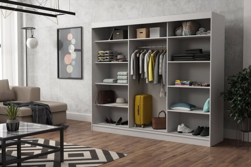 Za pełnymi frontami znajdują się głębokie półki oraz drążek na wieszaki, umożliwiający uporządkowanie garderoby. Istnieje możliwość zamontowania dodatkowego drążka lub półek. Szafa została wyposażona w system drzwi przesuwnych, które w łatwy i lekki sposób otworzysz i zamkniesz.