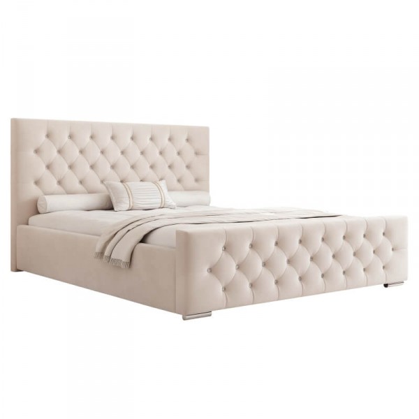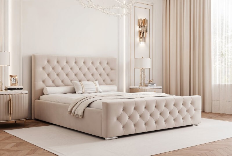 Wyposażone w duży pojemnik na pościel pod całym łóżkiem. Duże tapicerowane wezgłowie z kryształkami wykończone z dbałością o każdy detal efektownie zaprezentuje się w każdej sypialni.