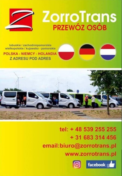 Firma ZorroTrans wykonuje licencjonowany przewóz Osób i paczek między Polską Niemcami i Holandią, jak i odwrotnie,obsługiwane województwa na terenie kraju to LUBUSKIE - ZACHODNIOPOMORSKIE , WIELKOPOLSKIE - KUJAWSKO POMORSKIE ,dysponujemy nowymi wygodnymi busami marki Renault Trafic,które są wyposażone w zestawy DVD, jezdzimy z adresu pod adres szybko i bezpiecznie CO PIATY PRZEJAZD 50% TANIEJ, zapraszamy serdecznie.