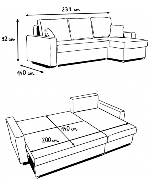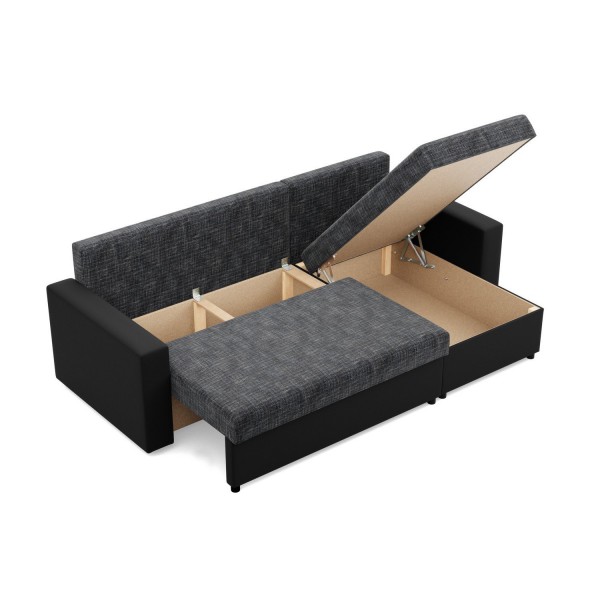W pojemnikach w siedzisku możesz schować pościel i inne domowe przedmioty. To rozwiązanie sprawia, że zyskujesz wszechstronny, wolnostojący mebel wyposażony w trzy miękkie, sprężyste poduszki z pokrowcami na zamek. Każda poduszka narożnika jest luźna, więc możesz je dowolnie przekładać, aby siedzieć lub leżeć wygodnie podczas domowej imprezy czy seansu przed telewizorem.