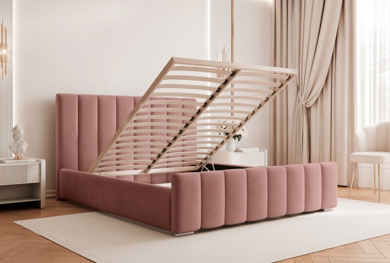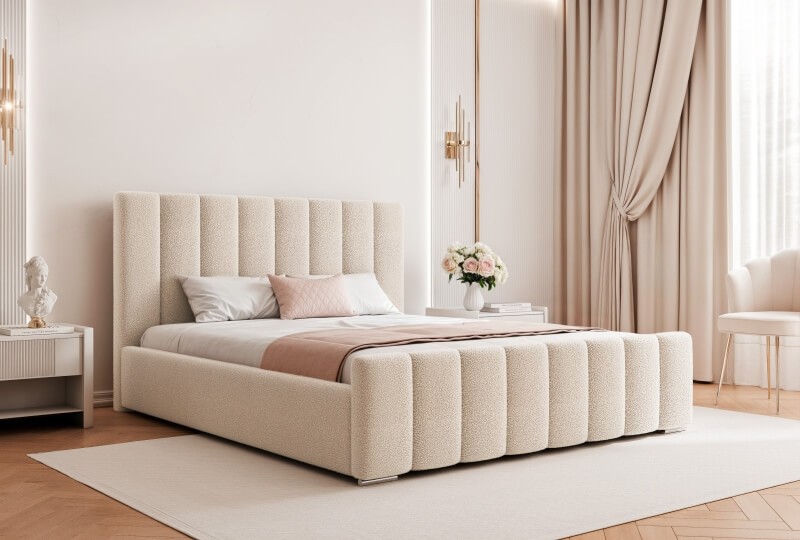 To wyjątkowa propozycja pod indywidualnie dobrany materac. Wyposażone w duży pojemnik na pościel pod całym łóżkiem i stelaż metalowy lub drewniany. Duże tapicerowane wezgłowie efektownie zaprezentuje się w każdej sypialni.