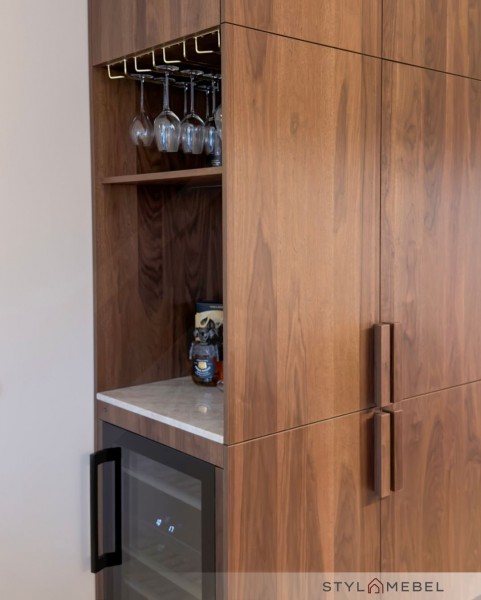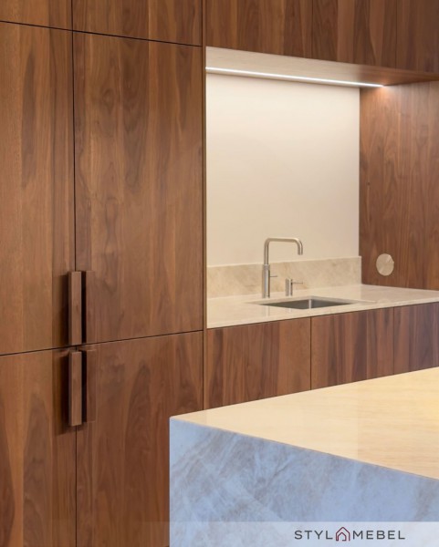 Głównym bohaterem są tutaj drewniane fronty Shinnoki które wprowadzają naturalne ciepło, idealnie skontrastowane z luksusowym blatem Taj Mahal