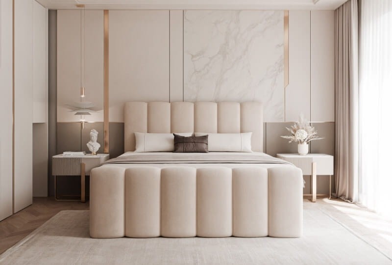 Wyjątkowe podwójne łóżko sypialniane z 2 pojemnikami na pościel. Zamieni sypialnię w wyjątkowy apartament. Wysokie tapicerowane pikowane wezgłowie oraz wysoki przednóżek dodają całości wyjątkowego charakteru. Dostępne w 5 rozmiarach zarówno do małej, jak i dużej sypialni.